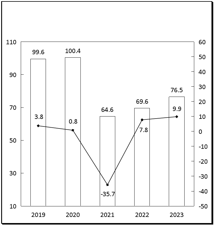 图5 2019-2023年年末金融机构贷款余额及增长速度