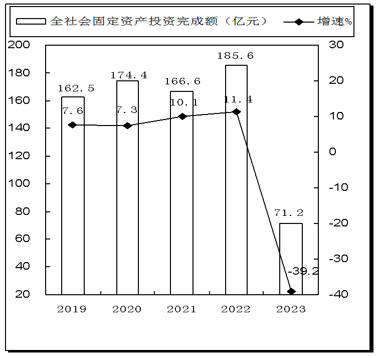 全区500万元以上固定资产投资项目226个。其中:续建项目168个;新建项目58个。完成固定资产投资71.2亿元,比上年下降39.2%。其中:基本建设投资完成56.5亿元;更新改造投资完成14.3亿元,比上年增长88.3%;房地产开发投资完成4292万元,比上年下降75.6%。